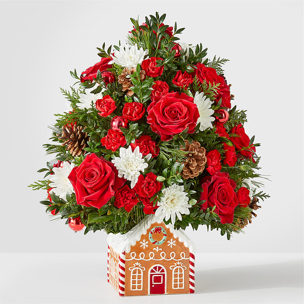 Spread holiday cheer with this adorable mini tree, handcrafted by a local florist in a gingerbread house container that is as sweet as the real deal.